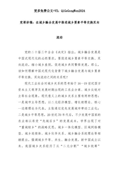 【七哥公文】2025年:党课讲稿:在城乡融合发展中推进城乡要素平等交换双向流动+更多免费公文+VX:QiGeGongWen2024+更多免费公文+VX:QiGeGongWen2024