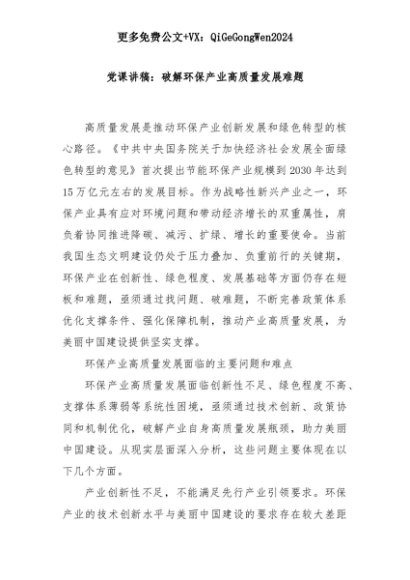 【七哥公文】2025年:党课讲稿:破解环保产业高质量发展难题+更多免费公文+VX:QiGeGongWen2024+更多免费公文+VX:QiGeGongWen2024
