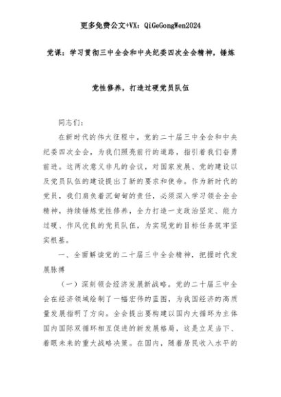 【七哥公文】2025年:党课:学习贯彻三中全会和中央纪委四次全会精神,锤炼党性修养,打造过硬党员队伍+更多免费公文+VX:QiGeGongWen2024+更多免费公文+VX:QiGeGongWen2024