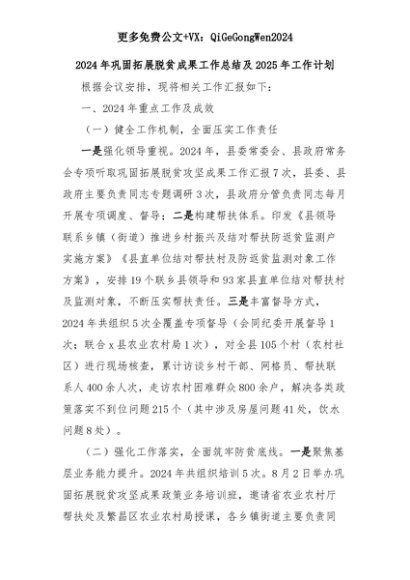 【七哥公文】2025年:2024年巩固拓展脱贫成果工作总结及2025年工作计划+更多免费公文+VX:QiGeGongWen2024+更多免费公文+VX:QiGeGongWen2024