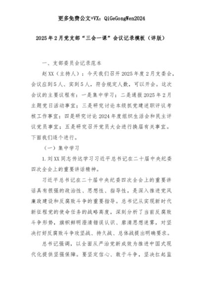 【七哥公文】2025年:2025年2月党支部“三会一课”会议记录模板(详版)+更多免费公文+VX:QiGeGongWen2024+更多免费公文+VX:QiGeGongWen2024