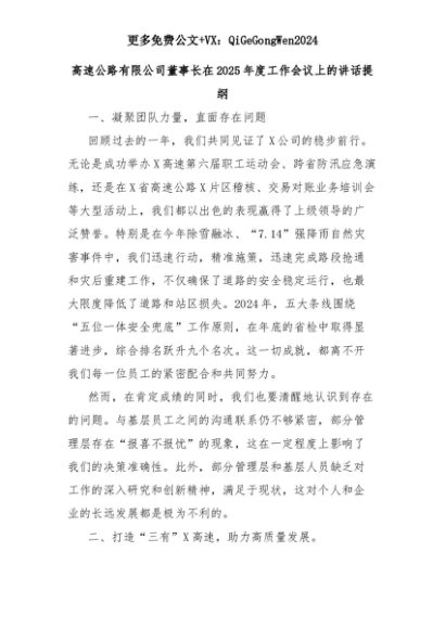 【七哥公文】2025年:高速公路有限公司董事长在2025年度工作会议上的讲话提纲+更多免费公文+VX:QiGeGongWen2024+更多免费公文+VX:QiGeGongWen2024