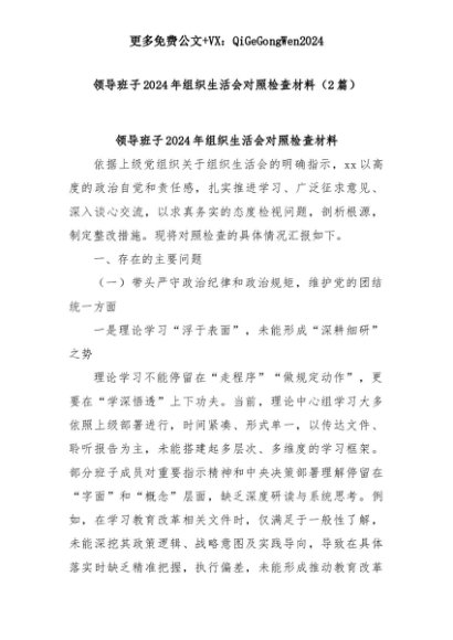 【七哥公文】2025年:(2篇)领导班子2024年组织生活会对照检查材料+更多免费公文+VX:QiGeGongWen2024+更多免费公文+VX:QiGeGongWen2024