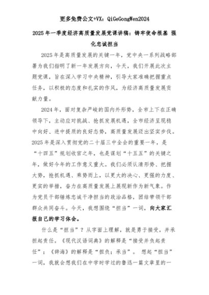 【七哥公文】2025年:2025年一季度经济高质量发展党课讲稿:铸牢使命根基 强化忠诚担当+更多免费公文+VX:QiGeGongWen2024+更多免费公文+VX:QiGeGongWen2024