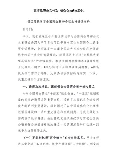 【七哥公文】2025年:县区传达学习全国两会精神会议主持讲话材料+更多免费公文+VX:QiGeGongWen2024+更多免费公文+VX:QiGeGongWen2024