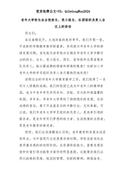 【七哥公文】2025年:老年大学校长在全校班长、党小组长、社团组织负责人会议上的讲话+更多免费公文+VX:QiGeGongWen2024+更多免费公文+VX:QiGeGongWen2024