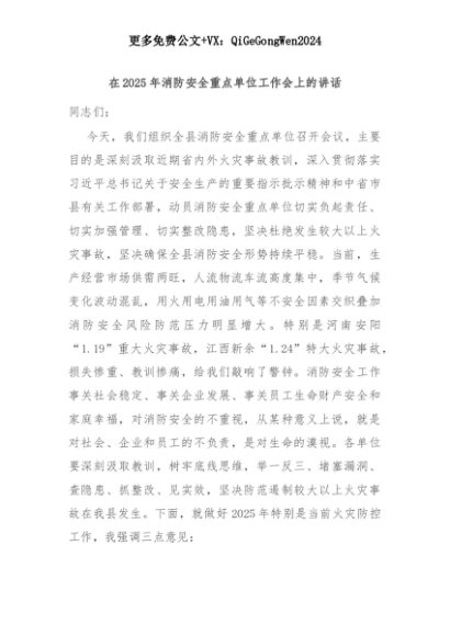 【七哥公文】2025年:在2025年消防安全重点单位工作会上的讲话+更多免费公文+VX:QiGeGongWen2024+更多免费公文+VX:QiGeGongWen2024