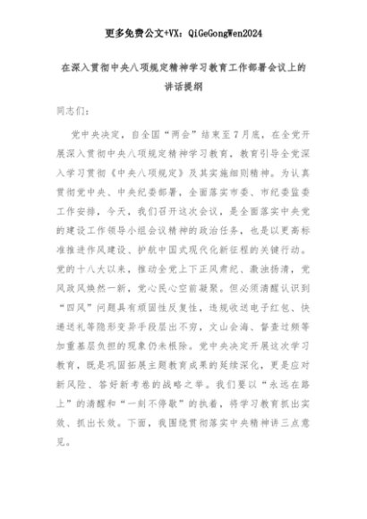 【七哥公文】2025年:在深入贯彻中央八项规定精神学习教育工作部署会议上的讲话提纲+更多免费公文+VX:QiGeGongWen2024+更多免费公文+VX:QiGeGongWen2024