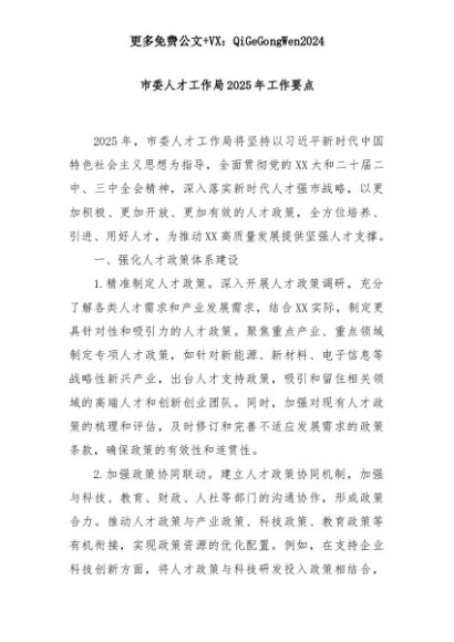 【七哥公文】2025年:市委人才工作局2025年工作要点+更多免费公文+VX:QiGeGongWen2024+更多免费公文+VX:QiGeGongWen2024