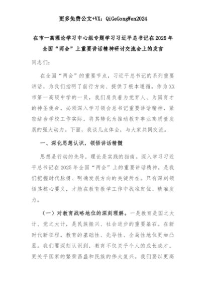 【七哥公文】2025年:在市一高理论学习中心组专题学习习近平总书记在2025年全国“两会”上重要讲话精神研讨交流会上的发言+更多免费公文+VX:QiGeGongWen2024+更多免费公文+VX:QiGeGongWen2024