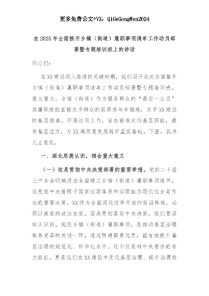 【七哥公文】2025年:在2025年全面推开乡镇(街道)履职事项清单工作动员部署暨专题培训班上的讲话+更多免费公文+VX:QiGeGongWen2024+更多免费公文+VX:QiGeGongWen2024