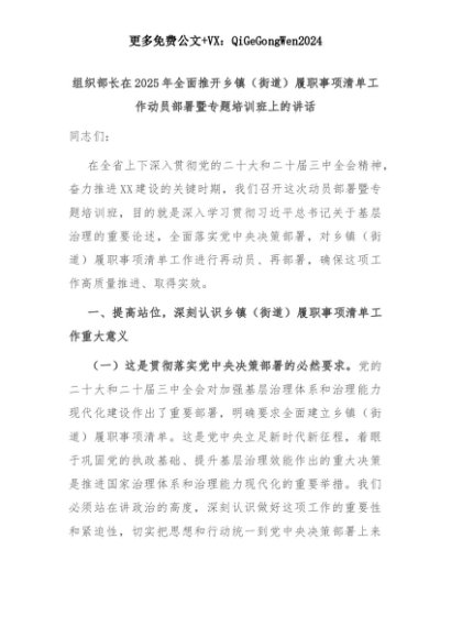 【七哥公文】2025年:组织部长在2025年全面推开乡镇(街道)履职事项清单工作动员部署暨专题培训班上的讲话+更多免费公文+VX:QiGeGongWen2024+更多免费公文+VX:QiGeGongWen2024