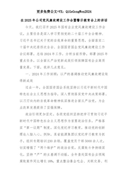 【七哥公文】2025年:在2025年公司党风廉政建设工作会暨警示教育会上的讲话+更多免费公文+VX:QiGeGongWen2024+更多免费公文+VX:QiGeGongWen2024