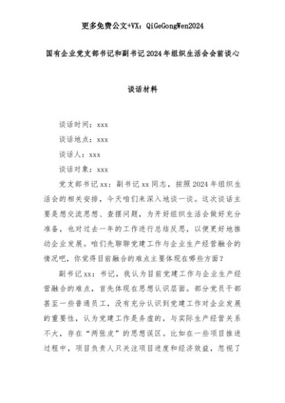【七哥公文】2025年:国有企业党支部书记和副书记2024年组织生活会会前谈心谈话材料+更多免费公文+VX:QiGeGongWen2024+更多免费公文+VX:QiGeGongWen2024