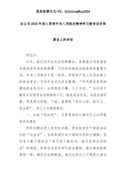 【七哥公文】2025年:在公司2025年深入贯彻中央八项规定精神学习教育动员部署会上的讲话+更多免费公文+VX:QiGeGongWen2024+更多免费公文+VX:QiGeGongWen2024