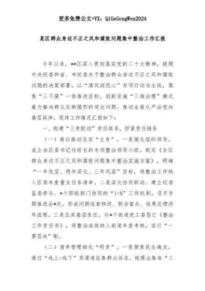 【七哥公文】2025年:某区群众身边不正之风和腐败问题集中整治工作汇报+更多免费公文+VX:QiGeGongWen2024+更多免费公文+VX:QiGeGongWen2024