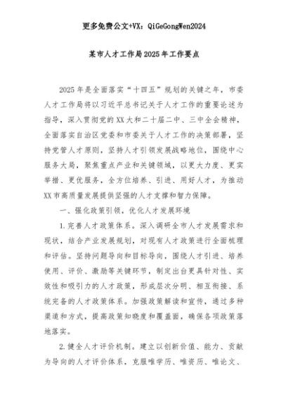 【七哥公文】2025年:某市人才工作局2025年工作要点+更多免费公文+VX:QiGeGongWen2024+更多免费公文+VX:QiGeGongWen2024