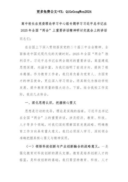 【七哥公文】2025年:高中校长在党委理论学习中心组专题学习习近平总书记在2025年全国“两会”上重要讲话精神研讨交流会上的讲话+更多免费公文+VX:QiGeGongWen2024+更多免费公文+VX:QiGeGongWen2024