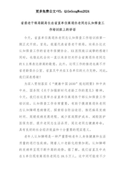 【七哥公文】2025年:省委老干部局副局长在省直单位离退休老同志认知筛查工作培训班上的讲话+更多免费公文+VX:QiGeGongWen2024+更多免费公文+VX:QiGeGongWen2024