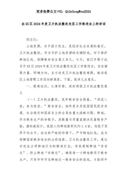 【七哥公文】2025年:在XX区2024年度卫片执法整改攻坚工作推进会上的讲话+更多免费公文+VX:QiGeGongWen2024+更多免费公文+VX:QiGeGongWen2024