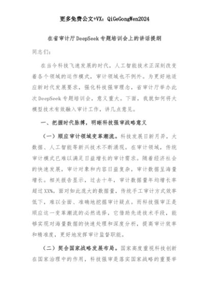 【七哥公文】2025年:在省审计厅DeepSeek专题培训会上的讲话提纲+更多免费公文+VX:QiGeGongWen2024+更多免费公文+VX:QiGeGongWen2024