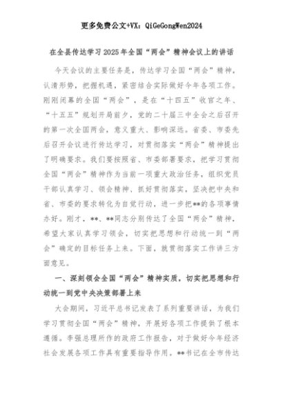 【七哥公文】2025年:在全县传达学习2025年全国“两会”精神会议上的讲话+更多免费公文+VX:QiGeGongWen2024+更多免费公文+VX:QiGeGongWen2024