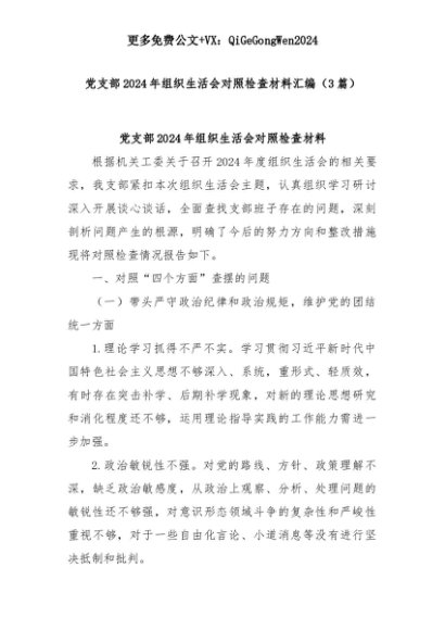 【七哥公文】2025年:(3篇)党支部2024年组织生活会对照检查材料汇编+更多免费公文+VX:QiGeGongWen2024+更多免费公文+VX:QiGeGongWen2024