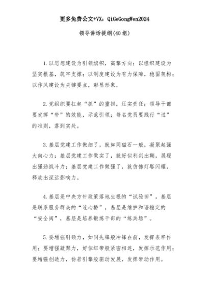 【七哥公文】2025年:(40组)领导讲话提纲+更多免费公文+VX:QiGeGongWen2024+更多免费公文+VX:QiGeGongWen2024
