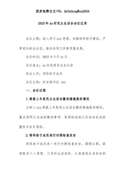 【七哥公文】2025年:2025年xx村民主生活会会议记录+更多免费公文+VX:QiGeGongWen2024+更多免费公文+VX:QiGeGongWen2024