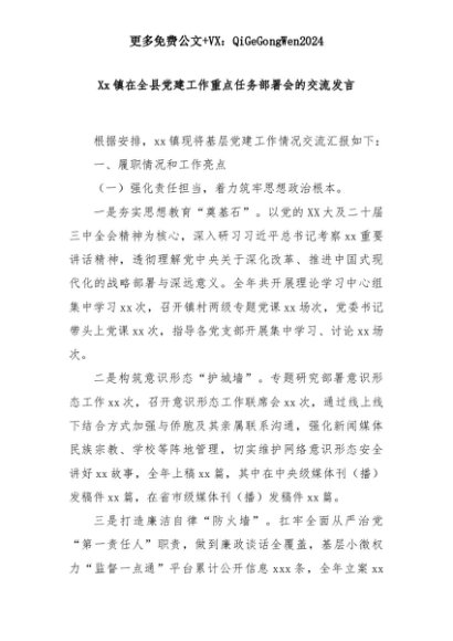 【七哥公文】2025年:Xx镇在全县党建工作重点任务部署会的交流发言+更多免费公文+VX:QiGeGongWen2024+更多免费公文+VX:QiGeGongWen2024