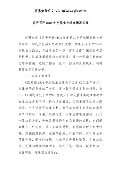 【七哥公文】2025年:关于召开2024年度民主生活会情况汇报+更多免费公文+VX:QiGeGongWen2024+更多免费公文+VX:QiGeGongWen2024
