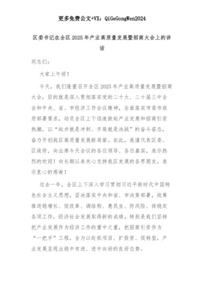 【七哥公文】2025年:区委书记在全区2025年产业高质量发展暨招商大会上的讲话+更多免费公文+VX:QiGeGongWen2024+更多免费公文+VX:QiGeGongWen2024