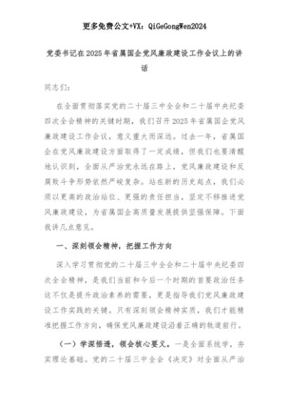 【七哥公文】2025年:党委书记在2025年省属国企党风廉政建设工作会议上的讲话+更多免费公文+VX:QiGeGongWen2024+更多免费公文+VX:QiGeGongWen2024