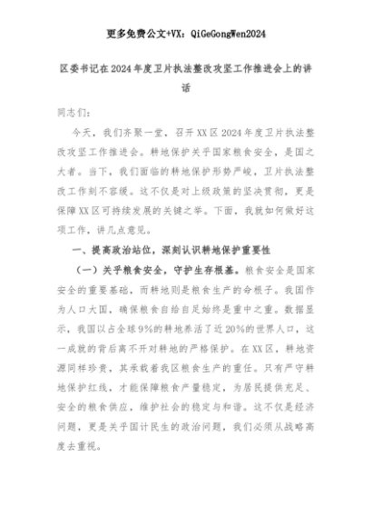 【七哥公文】2025年:区委书记在2024年度卫片执法整改攻坚工作推进会上的讲话+更多免费公文+VX:QiGeGongWen2024+更多免费公文+VX:QiGeGongWen2024