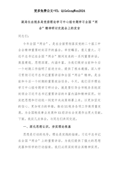 【七哥公文】2025年:副局长在税务局党委理论学习中心组专题学习全国“两会”精神研讨交流会上的发言+更多免费公文+VX:QiGeGongWen2024+更多免费公文+VX:QiGeGongWen2024