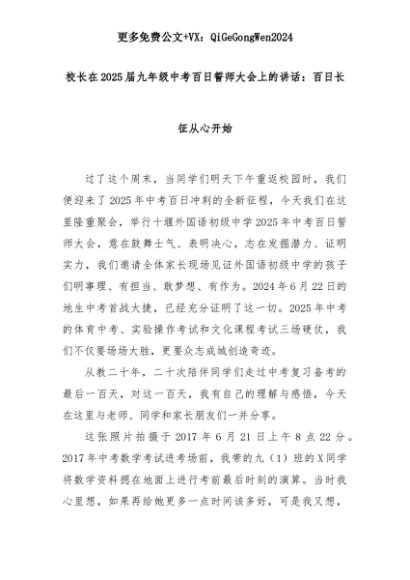 【七哥公文】2025年:校长在2025届九年级中考百日誓师大会上的讲话:百日长征从心开始+更多免费公文+VX:QiGeGongWen2024+更多免费公文+VX:QiGeGongWen2024