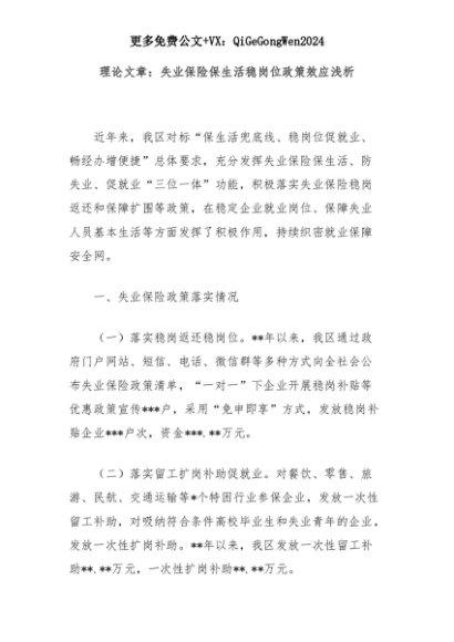 【七哥公文】2025年:理论文章:失业保险保生活稳岗位政策效应浅析+更多免费公文+VX:QiGeGongWen2024+更多免费公文+VX:QiGeGongWen2024