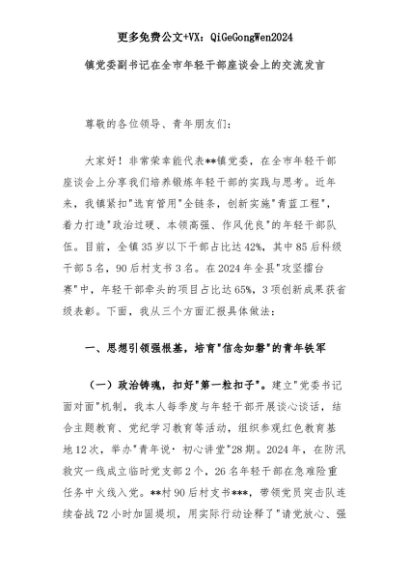 【七哥公文】2025年:镇党委副书记在全市年轻干部座谈会上的交流发言+更多免费公文+VX:QiGeGongWen2024+更多免费公文+VX:QiGeGongWen2024