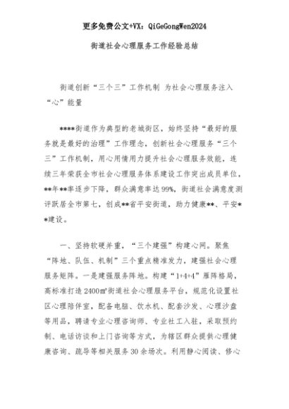 【七哥公文】2025年:街道社会心理服务工作经验总结+更多免费公文+VX:QiGeGongWen2024+更多免费公文+VX:QiGeGongWen2024