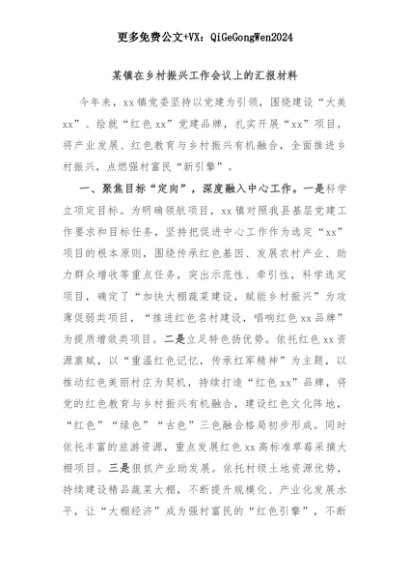 【七哥公文】2025年:某镇在乡村振兴工作会议上的汇报材料+更多免费公文+VX:QiGeGongWen2024+更多免费公文+VX:QiGeGongWen2024