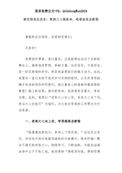 【七哥公文】2025年:新任职表态发言:秉持三心践使命,砥砺奋进启新程+更多免费公文+VX:QiGeGongWen2024+更多免费公文+VX:QiGeGongWen2024