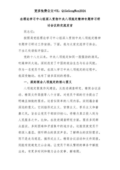 【七哥公文】2025年:在理论学习中心组深入贯彻中央八项规定精神专题学习研讨会议的交流发言+更多免费公文+VX:QiGeGongWen2024+更多免费公文+VX:QiGeGongWen2024