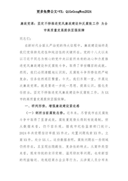 【七哥公文】2025年:廉政党课:坚定不移推进党风廉政建设和反腐败工作 为全市高质量发展提供坚强保障+更多免费公文+VX:QiGeGongWen2024+更多免费公文+VX:QiGeGongWen2024