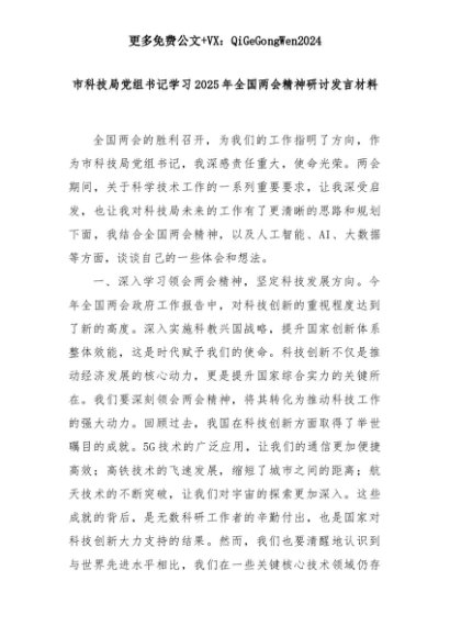 【七哥公文】2025年:市科技局党组书记学习2025年全国两会精神研讨发言材料+更多免费公文+VX:QiGeGongWen2024+更多免费公文+VX:QiGeGongWen2024