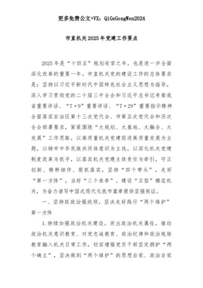 【七哥公文】2025年:市直机关2025年党建工作要点+更多免费公文+VX:QiGeGongWen2024+更多免费公文+VX:QiGeGongWen2024