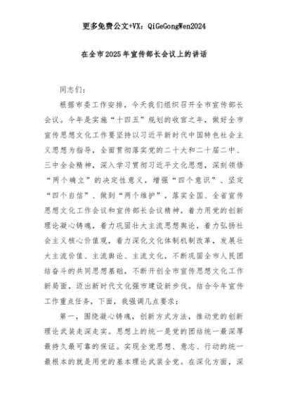 【七哥公文】2025年:在全市2025年宣传部长会议上的讲话+更多免费公文+VX:QiGeGongWen2024+更多免费公文+VX:QiGeGongWen2024