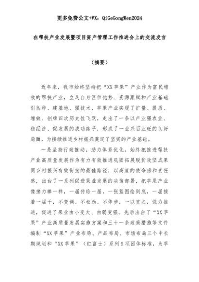 【七哥公文】2025年:在帮扶产业发展暨项目资产管理工作推进会上的交流发言(摘要)+更多免费公文+VX:QiGeGongWen2024+更多免费公文+VX:QiGeGongWen2024