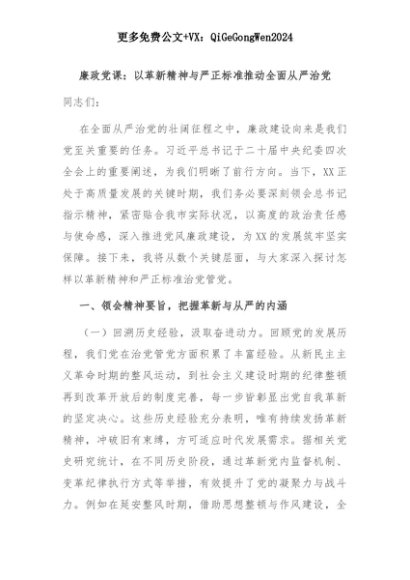 【七哥公文】2025年:廉政党课:以革新精神与严正标准推动全面从严治党+更多免费公文+VX:QiGeGongWen2024+更多免费公文+VX:QiGeGongWen2024
