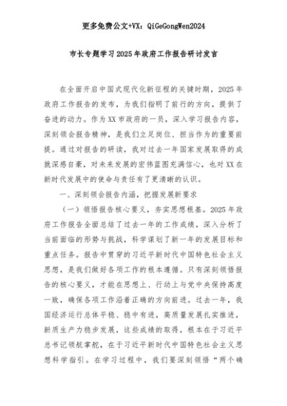 【七哥公文】2025年:市长专题学习2025年政府工作报告研讨发言+更多免费公文+VX:QiGeGongWen2024+更多免费公文+VX:QiGeGongWen2024