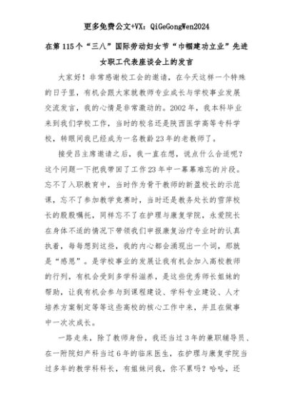 【七哥公文】2025年:在第115个“三八”国际劳动妇女节“巾帼建功立业”先进女职工代表座谈会上的发言+更多免费公文+VX:QiGeGongWen2024+更多免费公文+VX:QiGeGongWen2024